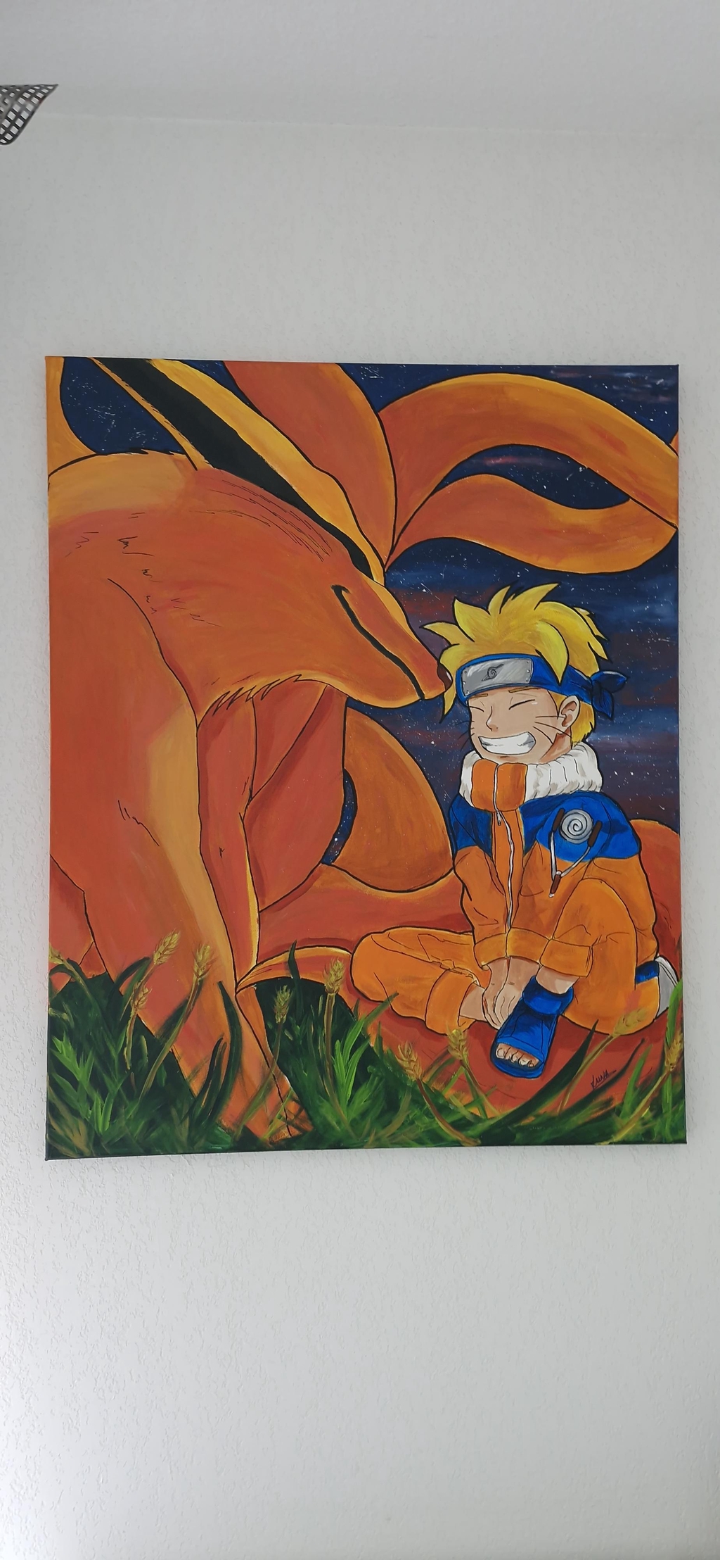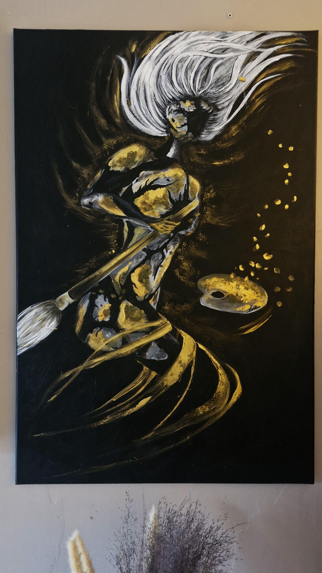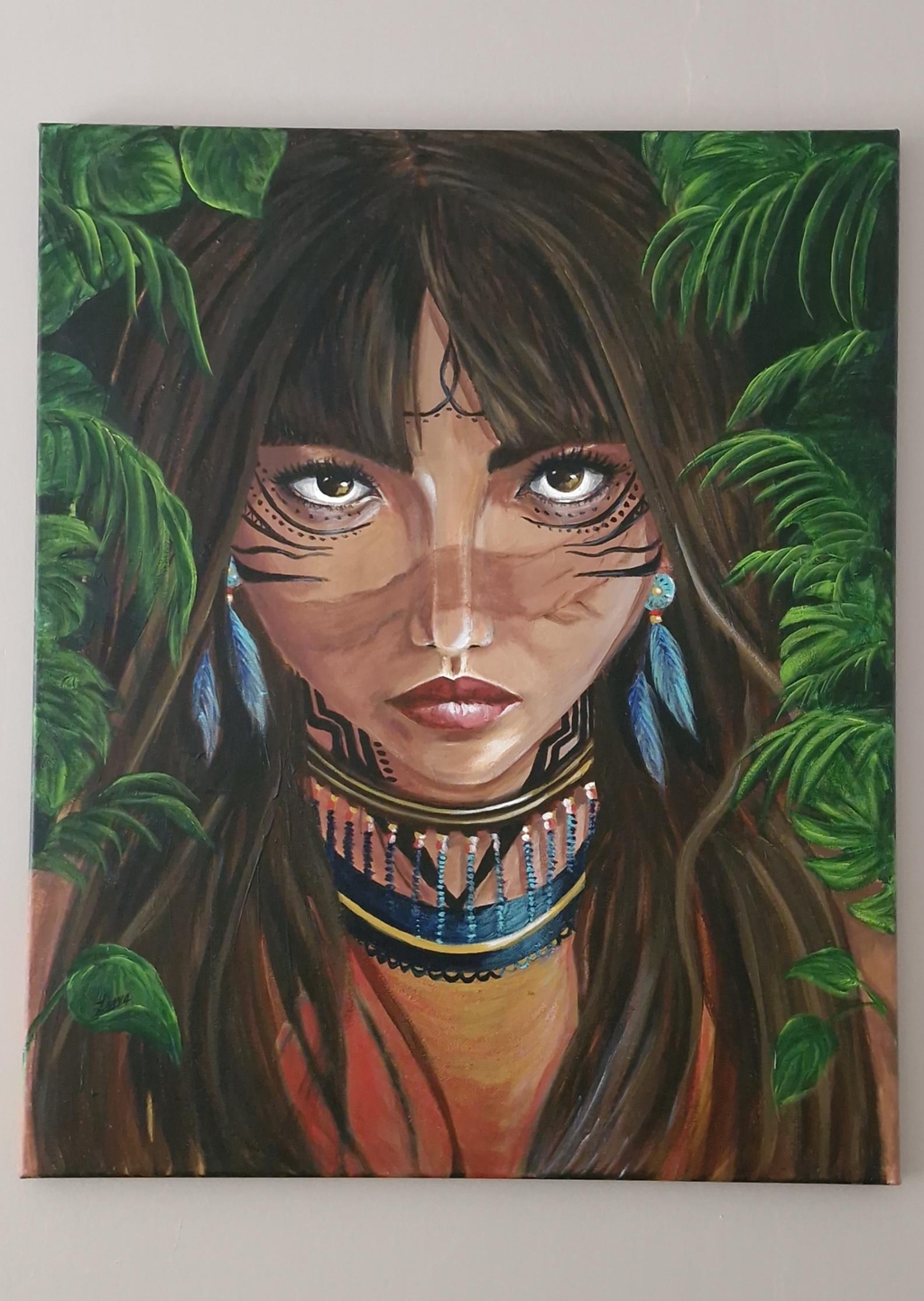 Toile peinte à l'acrylique avec deux couches de vernis satiné.